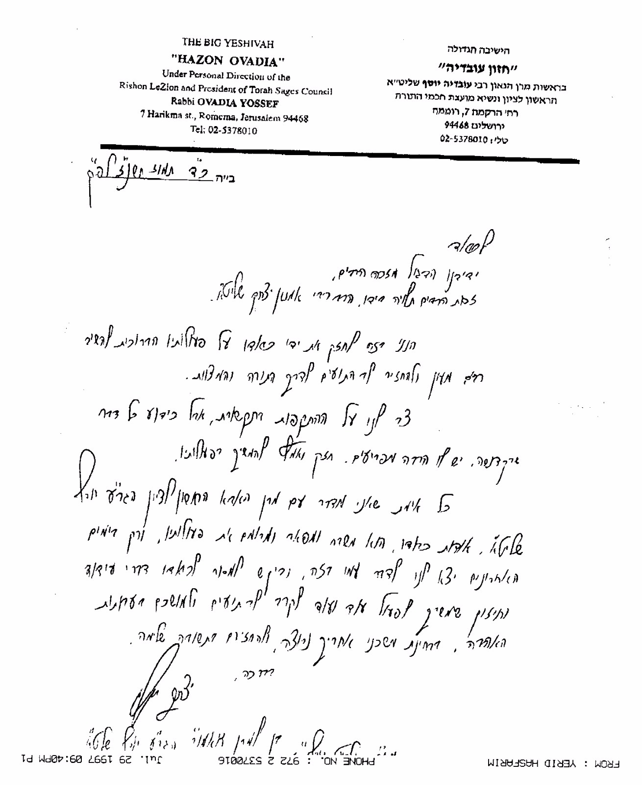כל אימת שאני מדבר עם מרן האבא הראשון לציון הגר"ע יוסף שליט"א, אודות כבודו, הוא משבח ומפאר ומרומם את פעולותיו, ורק בימים האחרונים יצא לנו לדבר עמו בזה, וביקש למסור לכבודו דברי עידוד וחיזוק שימשיך לפעול עוד ועוד לקרב תועים ולמושכם בעבותות האהבה, בבחינת משכני ואחריך נרוצה, להחזירם בתשובה שלמה.