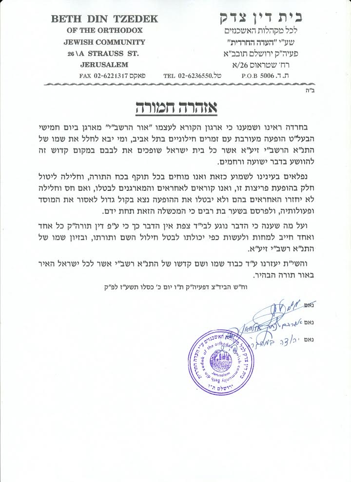 במכתב שפרסם הבית דין נכתב: "אנו מוחים בכל תוקף בכח התורה, וחלילה ליטול חלק בהופעת פריצות זו, ואנו קוראים לאחראים והמארגנים לבטל".