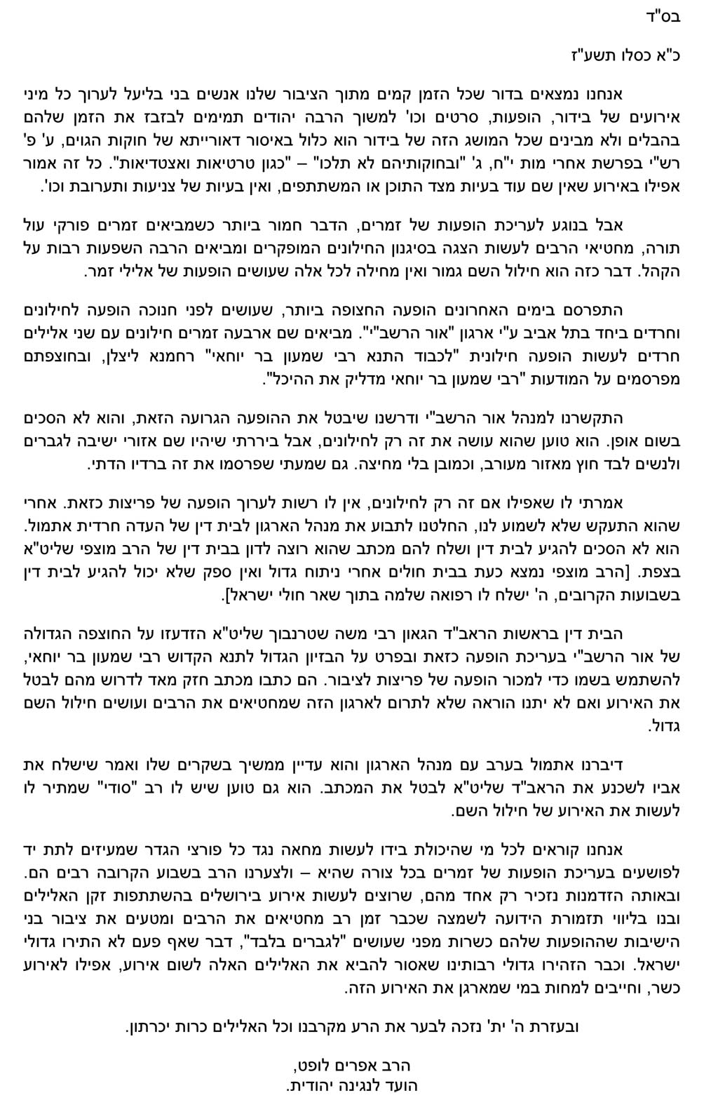 הרב אפרים לופט מועד לנגינה יהודית מספר במכתב מפורט את השתלשלות האירועים לנסות לבטל האירוע (צפיה במכתב המלא). אנו מביאים מקצת מהדברים שנכתבו: