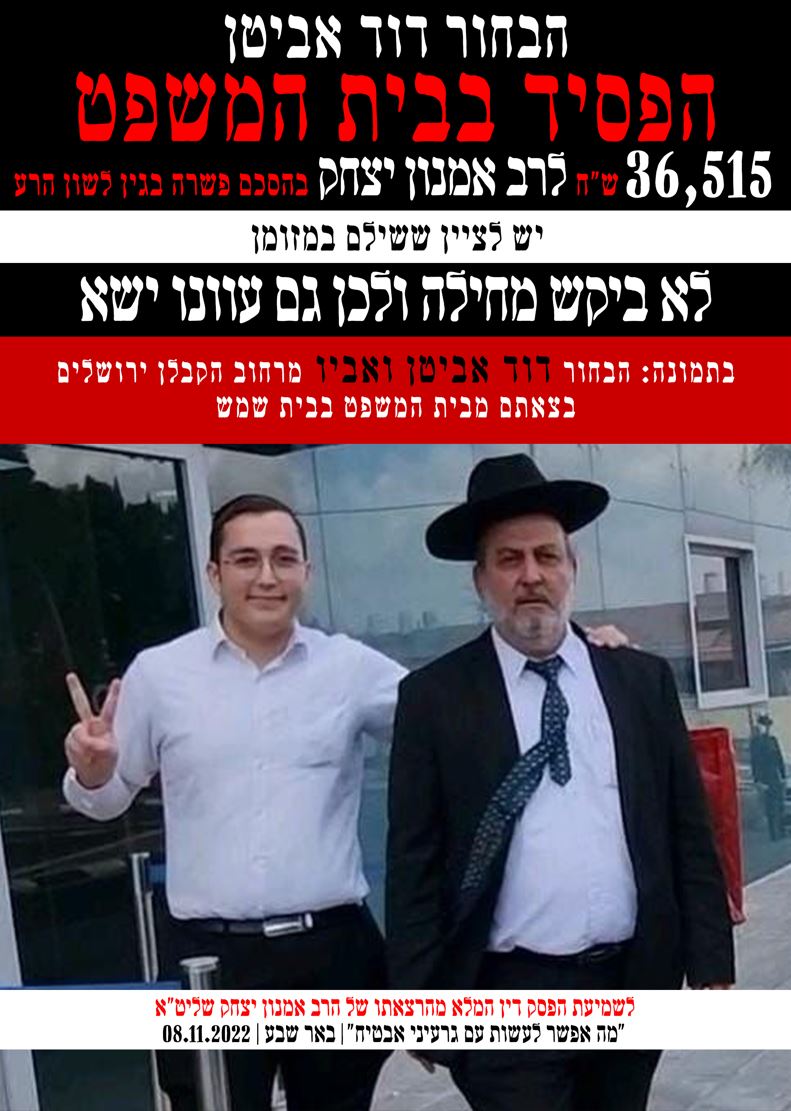 הבחור דוד אביטן הפסיד בבית המשפט 36,515 ש"ח לכבוד הרב אמנון יצחק שליט"א בהסכם פשרה בגין לשון הרע