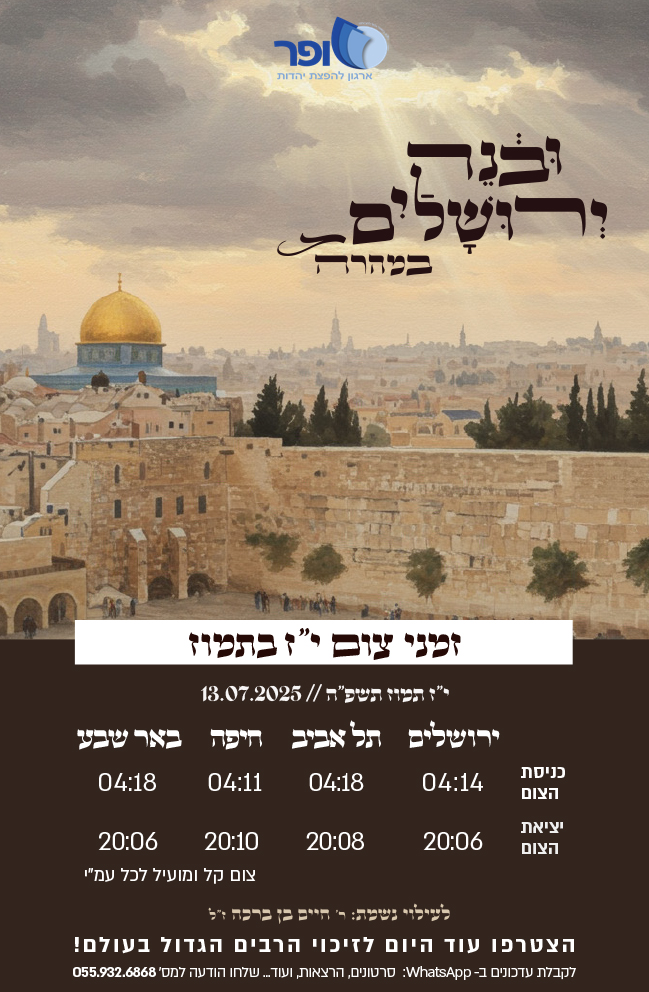פורסם בתאריך: 06.07.2023, 17:25 • מערכת שופרזמני צום יז' תמוז תשפה' (ימי בין המצרים) יה"ר שיהפכו השי"ת לטובה - אמן!