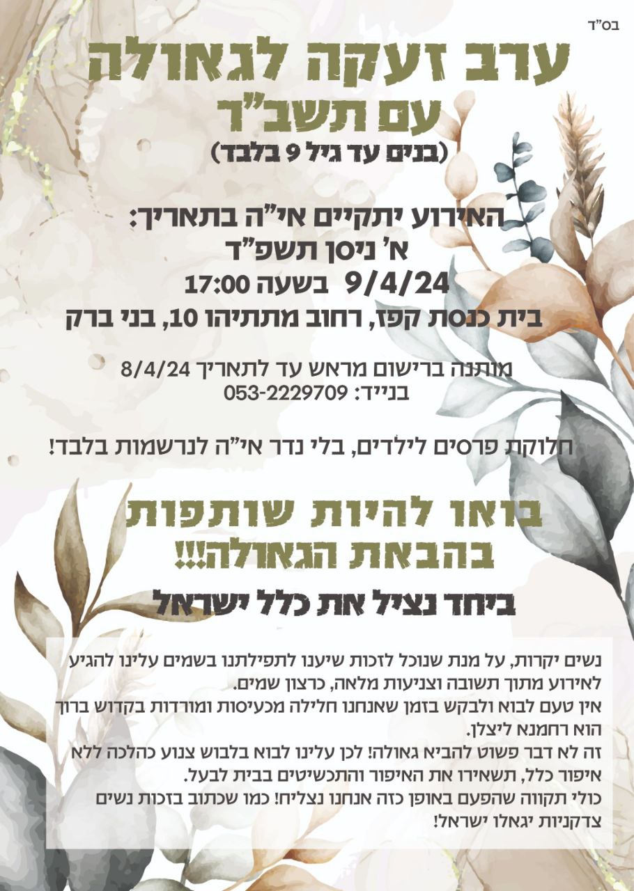 האירוע יתקיים אם ירצה השי"ת בתאריך א' בניסן ה'תשפ"ד