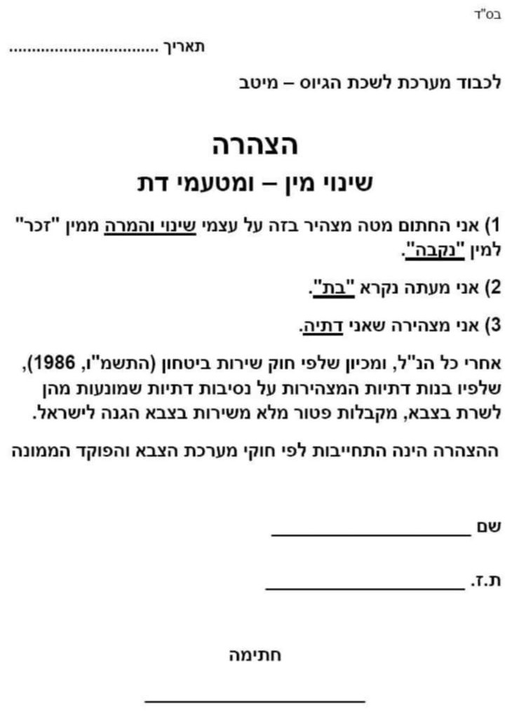 [1] היום אתה יכול להצהיר שהגדרתך אחרת מהמציאות שלך, למשל איש יכול לפי החוק לומר שהוא אשה... אם כן יכול הבחור ישיבה לומר להם: 'סליחה! אני לא מתגייס כיון שאני אשה! ואשה ששומרת תורה ומצוות - פטורה לפי החוק משרות! ואין אשה ששומרת תורה ומצות כמוני, כי יש לי זקן וחליפה ואני לומדת תורה!"...