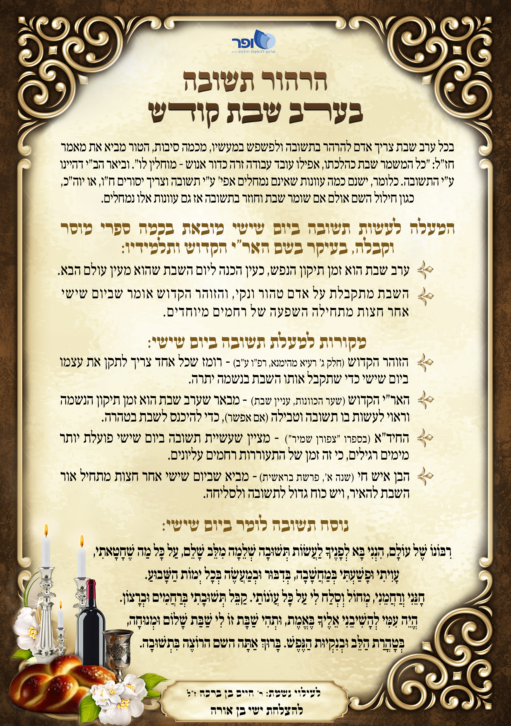 הרהור תשובה בערב שבת קודש - הנוסח הקצר בפנים