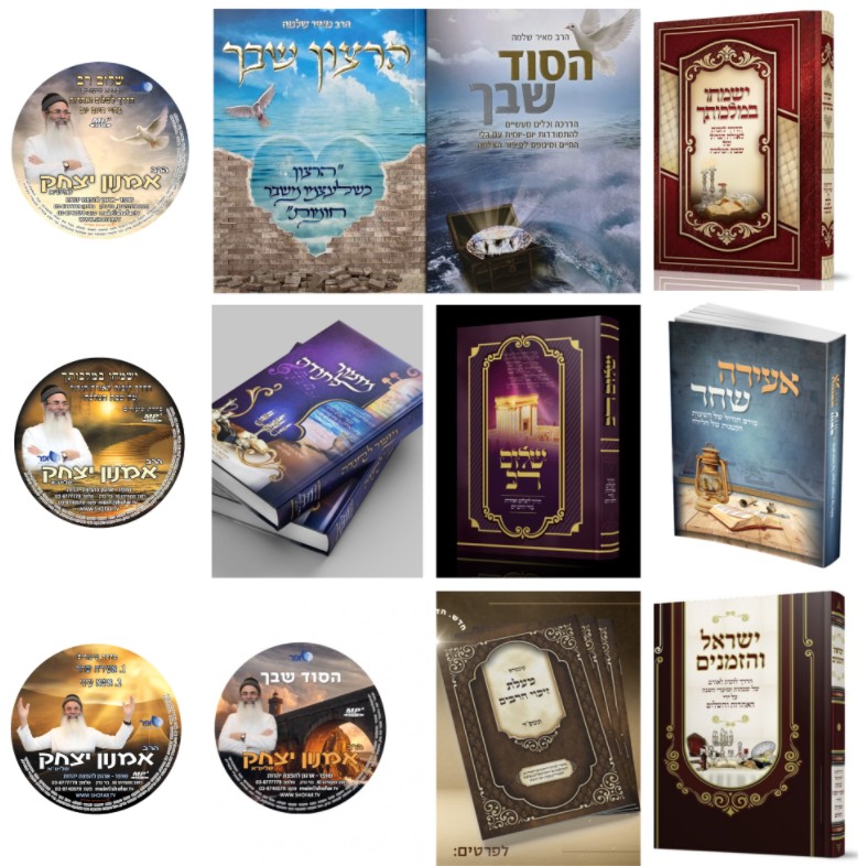 ספרי הרב מאיר שלמה זצ"ל וספרי בניו שליט"א, בהם; הסוד שבך, ישמחו במלכותך, אשא עיני, מזמור לתודה ועוד – זמינים כעת במחיר עלות! כולל דיסקים לשמיעה מפי הרב אמנון יצחק שליט"א. זכות להפיץ אור תורה.