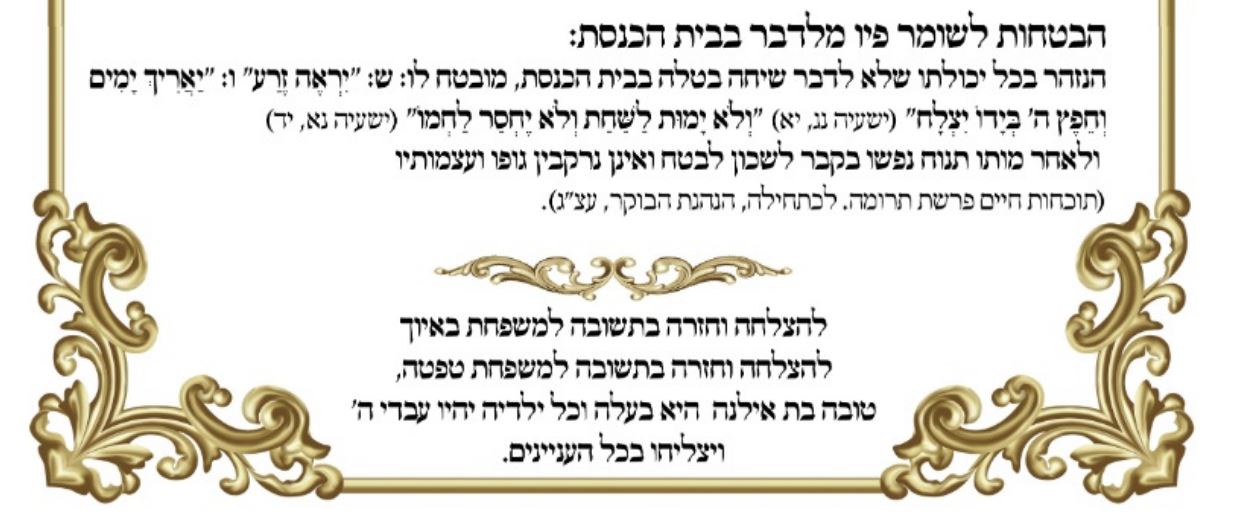 [נ.ב. אחד מהמעלות והשכר שזוכה מי שלא מדבר בבית הכנסת – מובא בשלט איסור דיבור בביכנ"ס שמודפס ע"י 'שופר' – ולאחר מותו תנוח נפשו בקבר לשכון לבטח ואינן נרקבין גופו ועצמותיו (תוכחות חיים פרשת תרומה לכתחילה הנהגת הבוקר עצ"ג)]