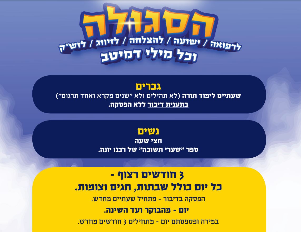 לכתבה: על הסגולה שעתים וחצי - סִפּוּר הַיְּשׁוּעָה שֶׁלְּךָ / שֶׁלָּךְ!! - לחץ כאן