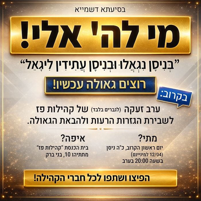 בסיעתא דשמיא "מִי לַיהֹוָה אֵלָי!" (זעקת משה רבינו ע"ה, שמות לב, כו) וכבר גילו חז"ל הקדושים זיע"א 'בְּנִיסָן נִגְאֵלוּ וּבְנִיסָן עֲתִידִין לִיגָאֵל' עם ישראל זועק: רוצים גאולה עכשיו!