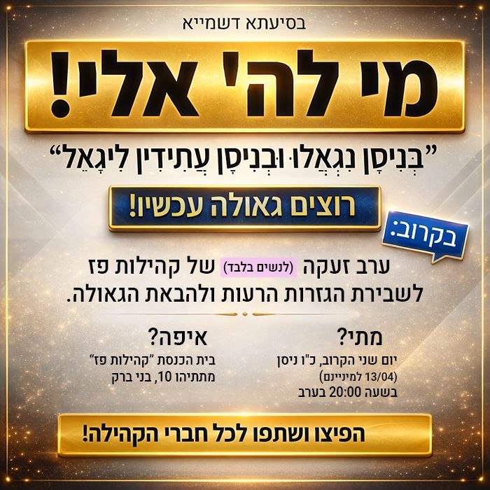 בס"ד, אתמול, ביום ראשון בשבת קודש, כה' ניסן ה'תשפ"ו (12.04.2026 למנינם) זכתה העיר בני ברק ובבית מדרש 'קהילות פז' טיפין טיפין החלו להגיע אנשי המעלה שליבם בוער בקרבם על הכאב האדיר שעדיין לא נושענו, רח"ל!