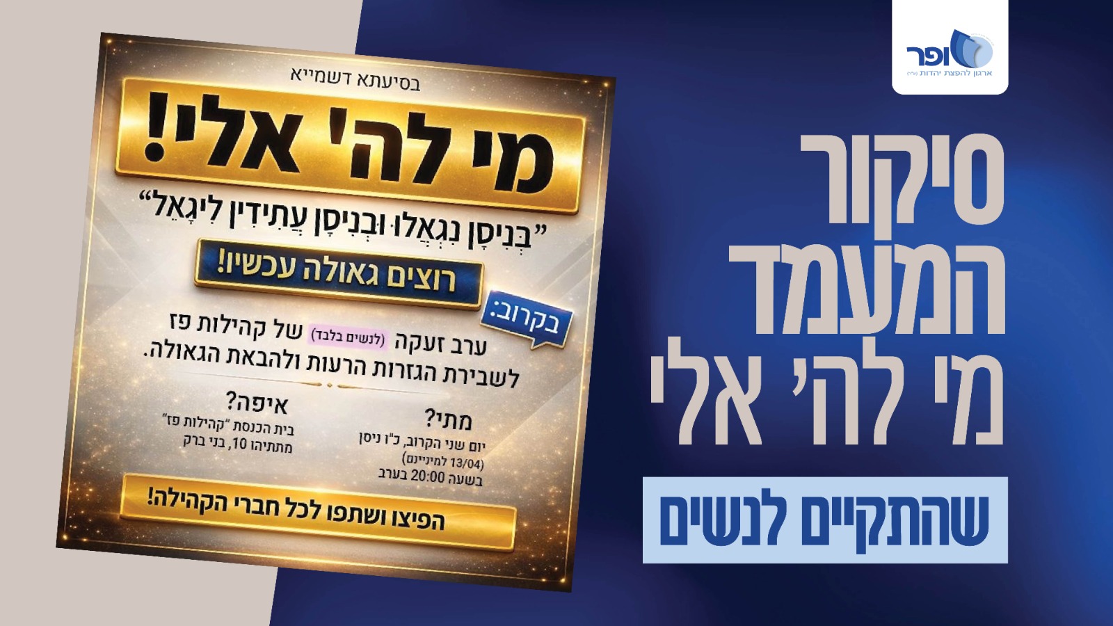 בס"ד, ביום שני בשבת קודש, כו' ניסן ה'תשפ"ו (13.04.2026 למנינם) זכתה שוב עיר התורה והחסידות בני ברק ובבית "מקדש מעט" 'קהילות פז' התכנסו שוב לאחר ערב הזעקה לגברים שהתקיים יום קודם לכן (לכתבת הסיקור – לחץ כאן)