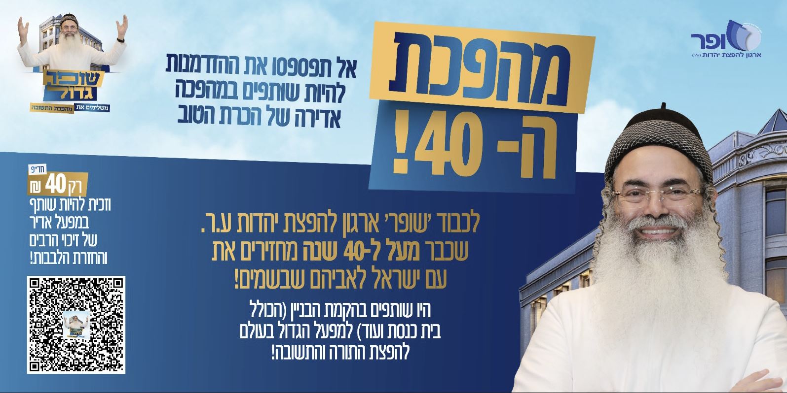 כולנו מתגייסים למשימה, בעזהשי"ת מליון איש תורמים רק 40₪ בלבד ואי"ה אנו מגיעים ליעד להקמת בניין לשופר בירושלים עיר הקודש!