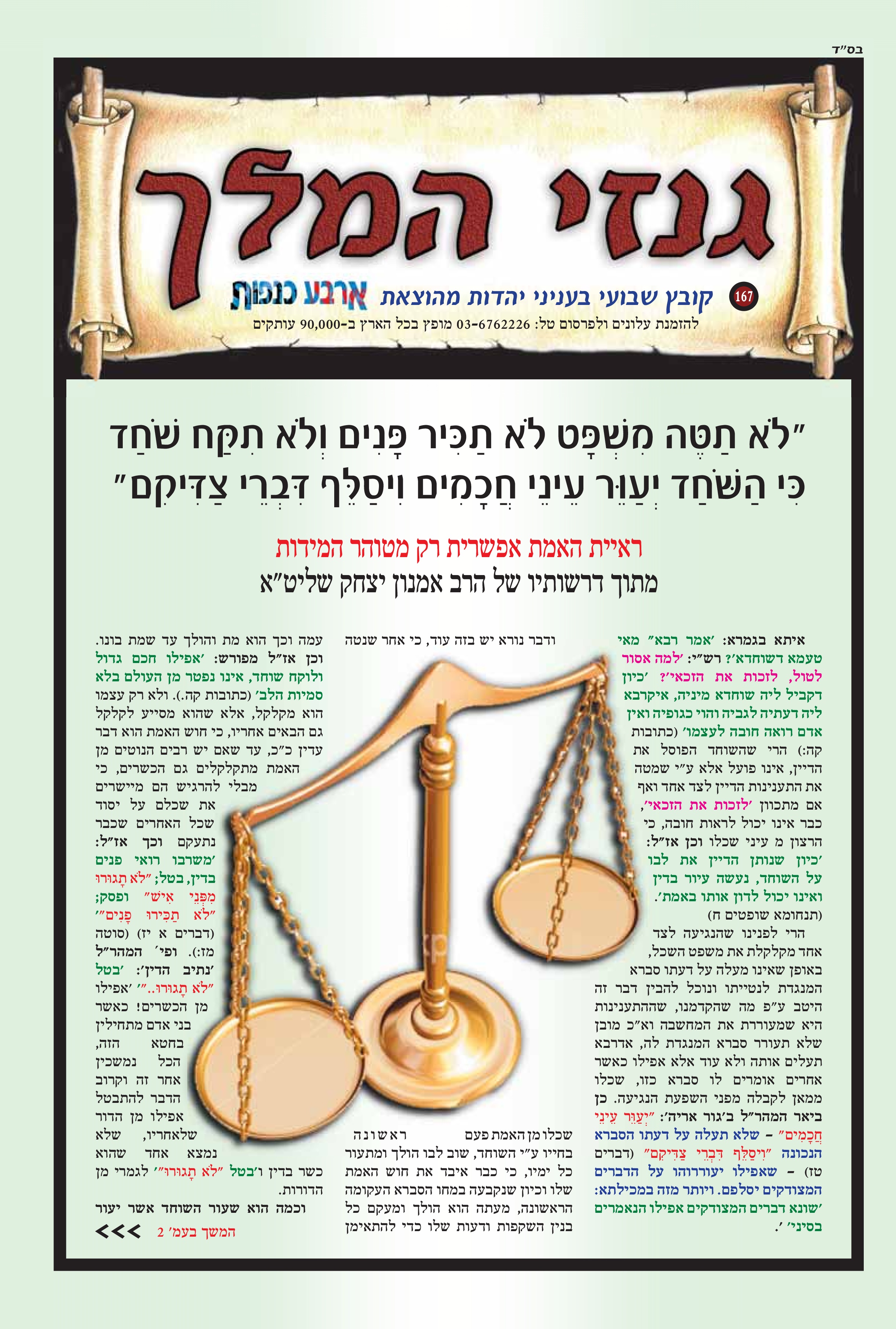 "ולא תטה משפט לא תכיר פנים ולא תקח שולד כי השחד יעוור עיני חכמים ויסלף דברי צדיקים" ראיית האמת אפשרית רק מטוהר המידות