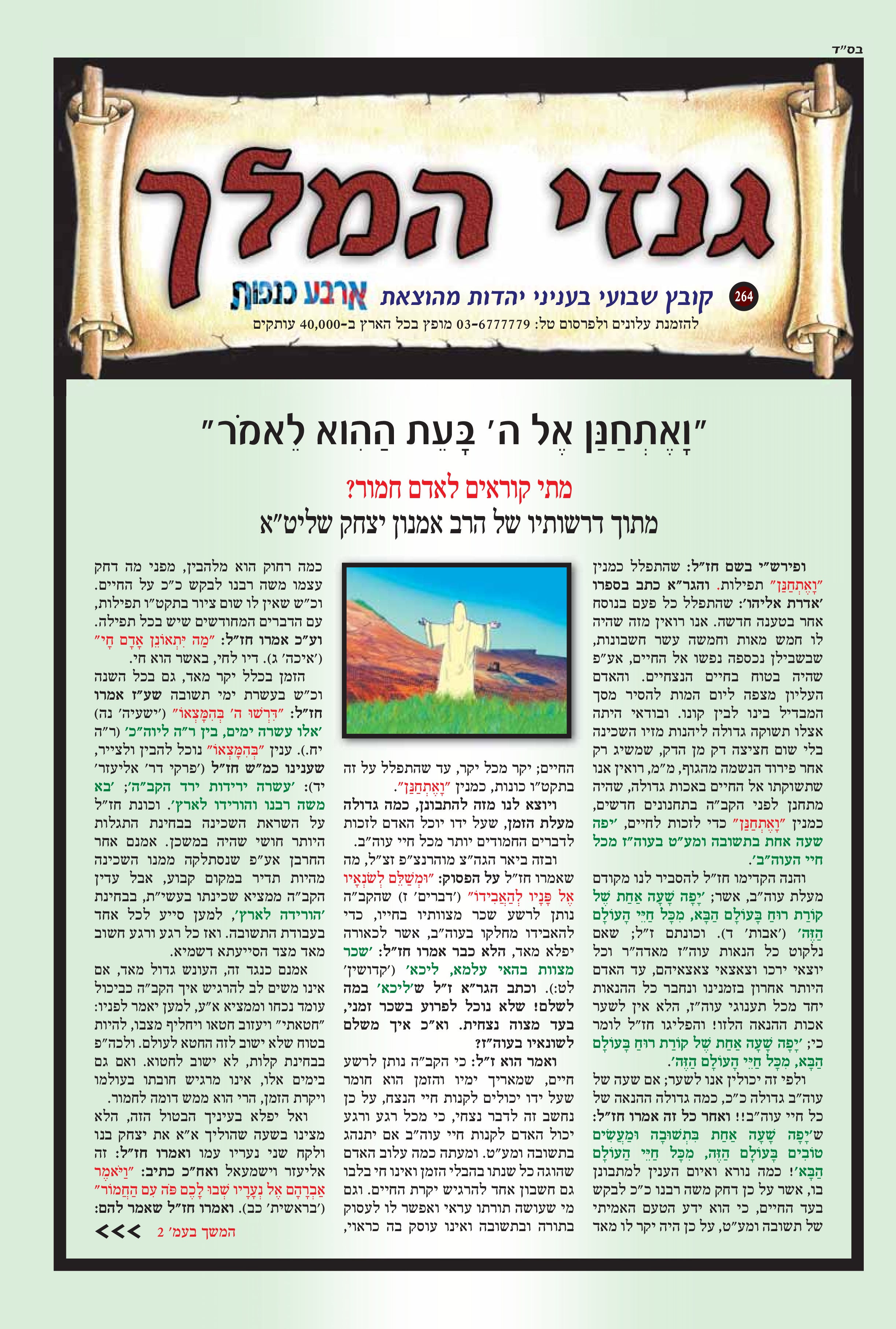 כבוד הרב, מאור עינינו, אין דף, עט ודיו היכולת להכיל את אשר ליבנו מבקש לומר. ב"ה בזכותכם רואים אנו עד כמה גדול אלוקי ישראל, כמה גדול אלוקי הרב אמנון יצחק, יה"ר שהשי"ת ישמרכם מכל מרעין בישין, וכל אויביכם שהם אויבי התורה הקדושה, שיפלו תחת רגליכם, אכי"ר. קשה ועצוב לראות את התופעה של קריעת מודעות, ואי אפשר להתרגל לכך. מר ממש. ואשרי הבחור שמדביק מחדש. כבוד הרב מלמד שאין אדם מלאך – אלא חצי אדם וחצי מלאך. אך כבוד הרב עצמו – אדם כמלאך. אתמול זכיתי למעט ביזיונות. שעת ניסיון קשה מאוד, אך ב"ה בזכותכם נשארתי שפויה לגמרי. יהי רצון שבזכות הבזיון שקבלתי ונתתי ברכת הדיוט למשפחה שהגיעה מרחוק לישועה – שיהיו להם בשורות טובות. בשורה משמחת נוספת, גיסי הניח ציצית ובירך, ואשתו ואנשים מסביב שמחו מאוד וענו אמן. ועוד כמה דברים יפים אירעו ביום שני. האוכל של א. מ. מטובל בטוב טעם ונדיבות, יה"ר שימשיכו ויצליחו, אמן. שוב אודה לכבוד הרב ולכל העמלים במלאכה – יהי רצון שהשם יתברך יגשים כל משאלות ליבכם לטובה. ותודה מיוחדת גם לרבנית היקרה, שאם לא אודה לה – הרי זו כפיות טובה ממש. ודבר אחרון היום בבוקר עברנו מהמקום, ששמו שלט ענק של מורינו והלב היה מלא שמחה לראות. יה"ר שנזכה ברחמים לקבל פני משיח צדקנו במהרה, אמן.