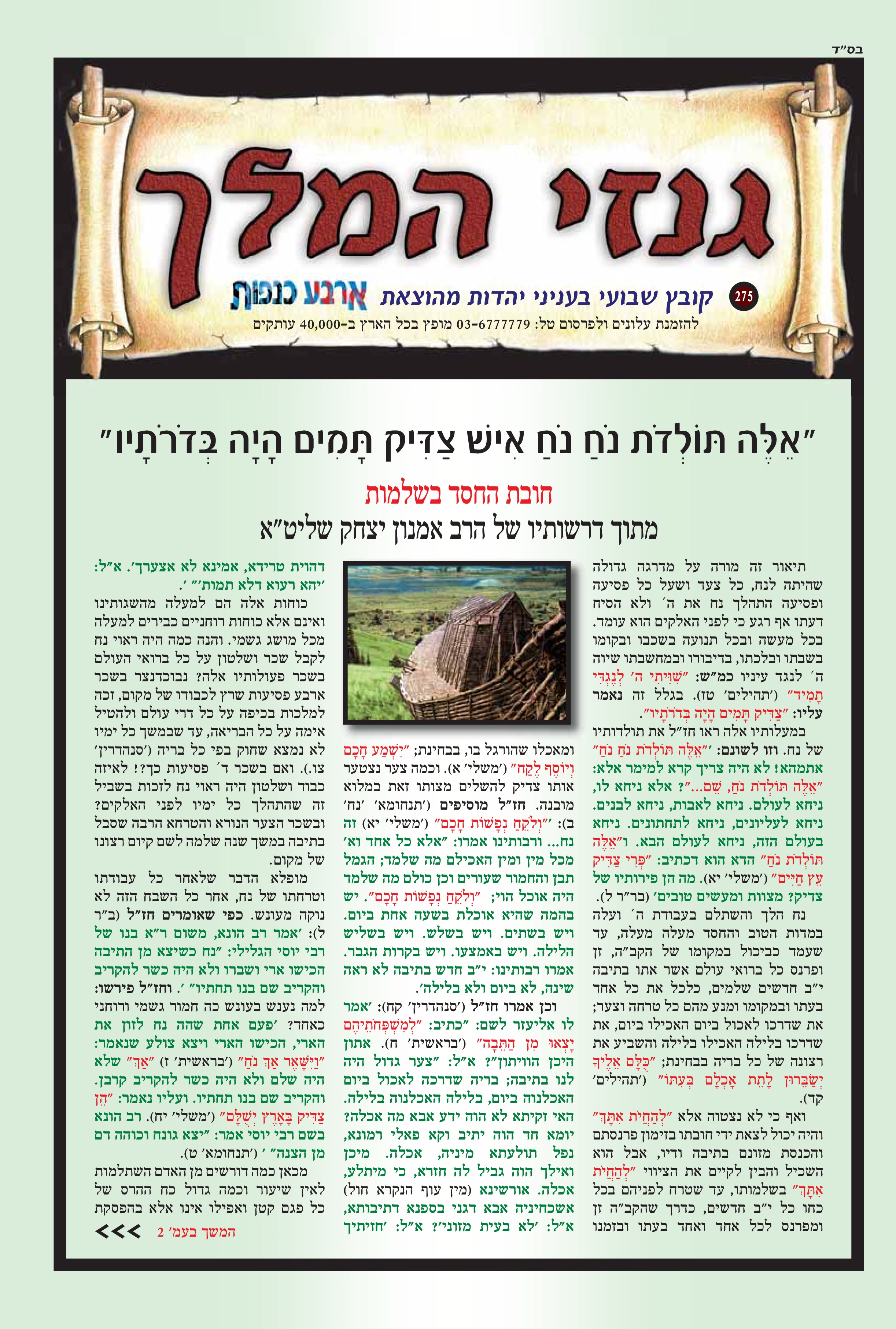 "אלה תולדות נח נח איש צדיק תמים היה בדורותיו" חובת החסד בשלמות