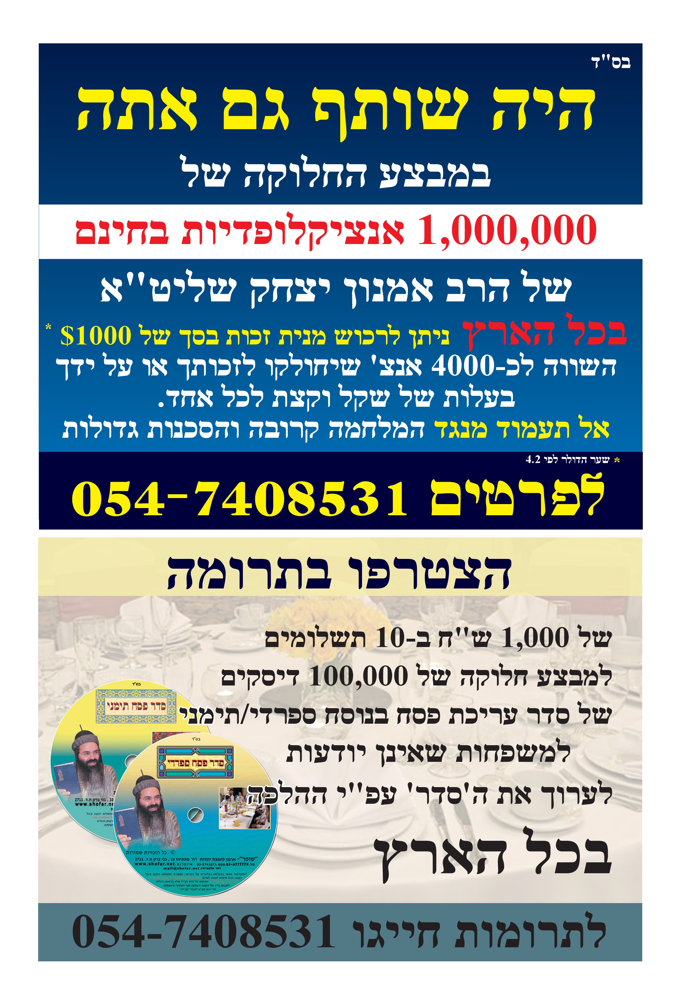 כבוד הרב, מאור עינינו, אין דף, עט ודיו היכולת להכיל את אשר ליבנו מבקש לומר. ב"ה בזכותכם רואים אנו עד כמה גדול אלוקי ישראל, כמה גדול אלוקי הרב אמנון יצחק, יה"ר שהשי"ת ישמרכם מכל מרעין בישין, וכל אויביכם שהם אויבי התורה הקדושה, שיפלו תחת רגליכם, אכי"ר. קשה ועצוב לראות את התופעה של קריעת מודעות, ואי אפשר להתרגל לכך. מר ממש. ואשרי הבחור שמדביק מחדש. כבוד הרב מלמד שאין אדם מלאך – אלא חצי אדם וחצי מלאך. אך כבוד הרב עצמו – אדם כמלאך. אתמול זכיתי למעט ביזיונות. שעת ניסיון קשה מאוד, אך ב"ה בזכותכם נשארתי שפויה לגמרי. יהי רצון שבזכות הבזיון שקבלתי ונתתי ברכת הדיוט למשפחה שהגיעה מרחוק לישועה – שיהיו להם בשורות טובות. בשורה משמחת נוספת, גיסי הניח ציצית ובירך, ואשתו ואנשים מסביב שמחו מאוד וענו אמן. ועוד כמה דברים יפים אירעו ביום שני. האוכל של א. מ. מטובל בטוב טעם ונדיבות, יה"ר שימשיכו ויצליחו, אמן. שוב אודה לכבוד הרב ולכל העמלים במלאכה – יהי רצון שהשם יתברך יגשים כל משאלות ליבכם לטובה. ותודה מיוחדת גם לרבנית היקרה, שאם לא אודה לה – הרי זו כפיות טובה ממש. ודבר אחרון היום בבוקר עברנו מהמקום, ששמו שלט ענק של מורינו והלב היה מלא שמחה לראות. יה"ר שנזכה ברחמים לקבל פני משיח צדקנו במהרה, אמן.