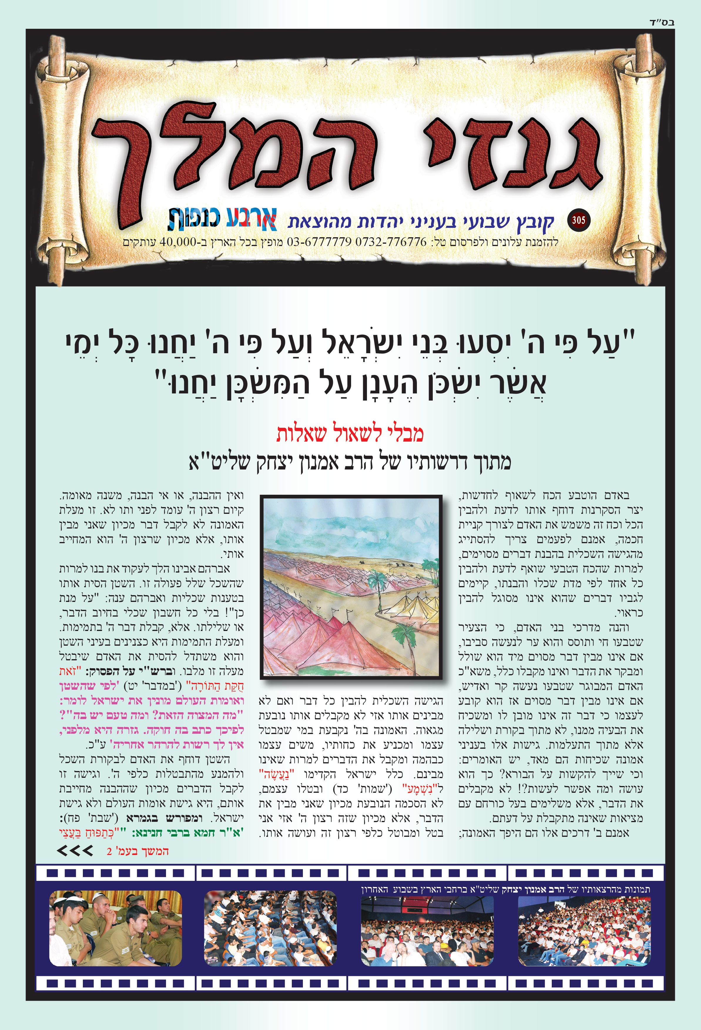 כבוד הרב, מאור עינינו, אין דף, עט ודיו היכולת להכיל את אשר ליבנו מבקש לומר. ב"ה בזכותכם רואים אנו עד כמה גדול אלוקי ישראל, כמה גדול אלוקי הרב אמנון יצחק, יה"ר שהשי"ת ישמרכם מכל מרעין בישין, וכל אויביכם שהם אויבי התורה הקדושה, שיפלו תחת רגליכם, אכי"ר. קשה ועצוב לראות את התופעה של קריעת מודעות, ואי אפשר להתרגל לכך. מר ממש. ואשרי הבחור שמדביק מחדש. כבוד הרב מלמד שאין אדם מלאך – אלא חצי אדם וחצי מלאך. אך כבוד הרב עצמו – אדם כמלאך. אתמול זכיתי למעט ביזיונות. שעת ניסיון קשה מאוד, אך ב"ה בזכותכם נשארתי שפויה לגמרי. יהי רצון שבזכות הבזיון שקבלתי ונתתי ברכת הדיוט למשפחה שהגיעה מרחוק לישועה – שיהיו להם בשורות טובות. בשורה משמחת נוספת, גיסי הניח ציצית ובירך, ואשתו ואנשים מסביב שמחו מאוד וענו אמן. ועוד כמה דברים יפים אירעו ביום שני. האוכל של א. מ. מטובל בטוב טעם ונדיבות, יה"ר שימשיכו ויצליחו, אמן. שוב אודה לכבוד הרב ולכל העמלים במלאכה – יהי רצון שהשם יתברך יגשים כל משאלות ליבכם לטובה. ותודה מיוחדת גם לרבנית היקרה, שאם לא אודה לה – הרי זו כפיות טובה ממש. ודבר אחרון היום בבוקר עברנו מהמקום, ששמו שלט ענק של מורינו והלב היה מלא שמחה לראות. יה"ר שנזכה ברחמים לקבל פני משיח צדקנו במהרה, אמן.