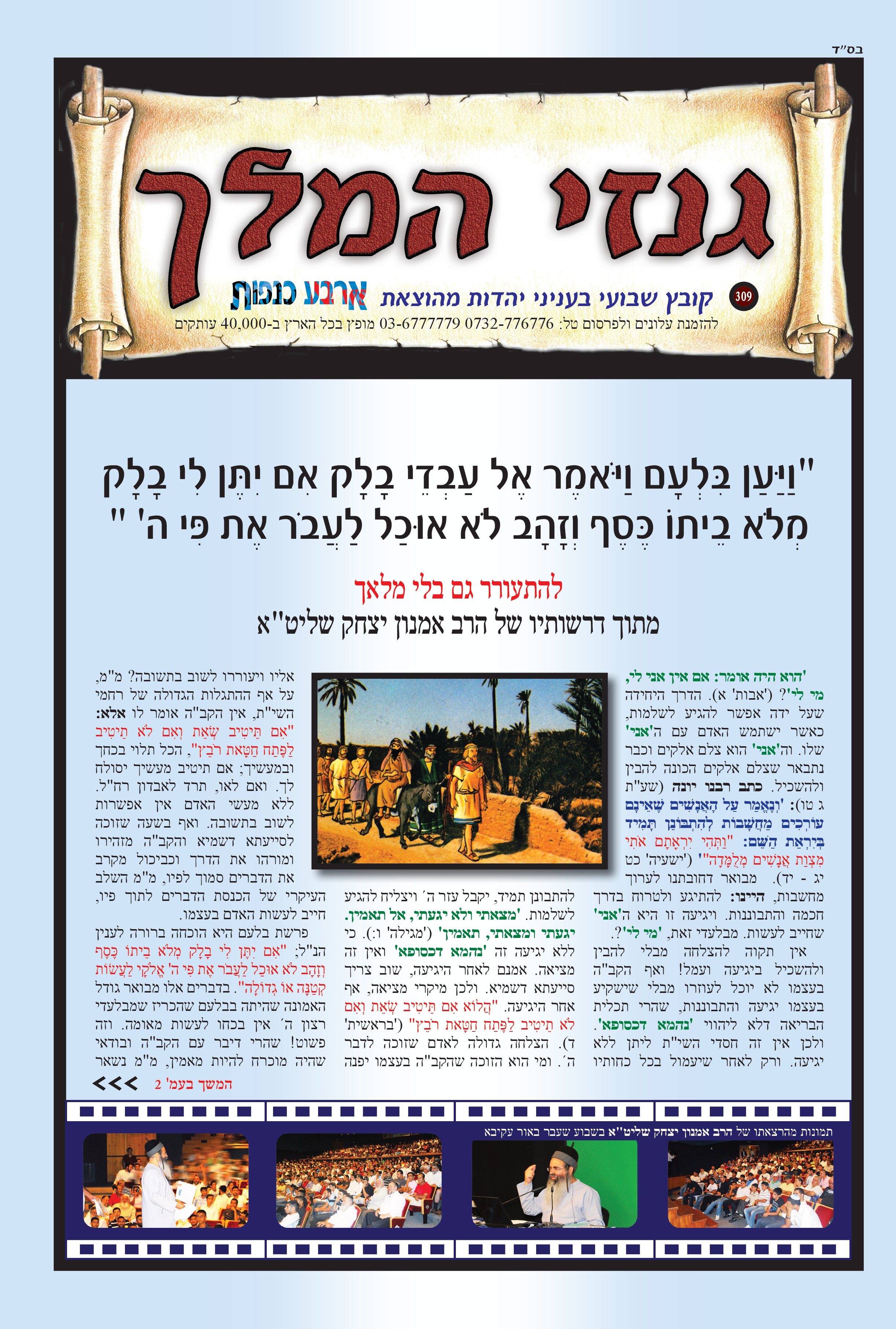 כבוד הרב, מאור עינינו, אין דף, עט ודיו היכולת להכיל את אשר ליבנו מבקש לומר. ב"ה בזכותכם רואים אנו עד כמה גדול אלוקי ישראל, כמה גדול אלוקי הרב אמנון יצחק, יה"ר שהשי"ת ישמרכם מכל מרעין בישין, וכל אויביכם שהם אויבי התורה הקדושה, שיפלו תחת רגליכם, אכי"ר. קשה ועצוב לראות את התופעה של קריעת מודעות, ואי אפשר להתרגל לכך. מר ממש. ואשרי הבחור שמדביק מחדש. כבוד הרב מלמד שאין אדם מלאך – אלא חצי אדם וחצי מלאך. אך כבוד הרב עצמו – אדם כמלאך. אתמול זכיתי למעט ביזיונות. שעת ניסיון קשה מאוד, אך ב"ה בזכותכם נשארתי שפויה לגמרי. יהי רצון שבזכות הבזיון שקבלתי ונתתי ברכת הדיוט למשפחה שהגיעה מרחוק לישועה – שיהיו להם בשורות טובות. בשורה משמחת נוספת, גיסי הניח ציצית ובירך, ואשתו ואנשים מסביב שמחו מאוד וענו אמן. ועוד כמה דברים יפים אירעו ביום שני. האוכל של א. מ. מטובל בטוב טעם ונדיבות, יה"ר שימשיכו ויצליחו, אמן. שוב אודה לכבוד הרב ולכל העמלים במלאכה – יהי רצון שהשם יתברך יגשים כל משאלות ליבכם לטובה. ותודה מיוחדת גם לרבנית היקרה, שאם לא אודה לה – הרי זו כפיות טובה ממש. ודבר אחרון היום בבוקר עברנו מהמקום, ששמו שלט ענק של מורינו והלב היה מלא שמחה לראות. יה"ר שנזכה ברחמים לקבל פני משיח צדקנו במהרה, אמן.