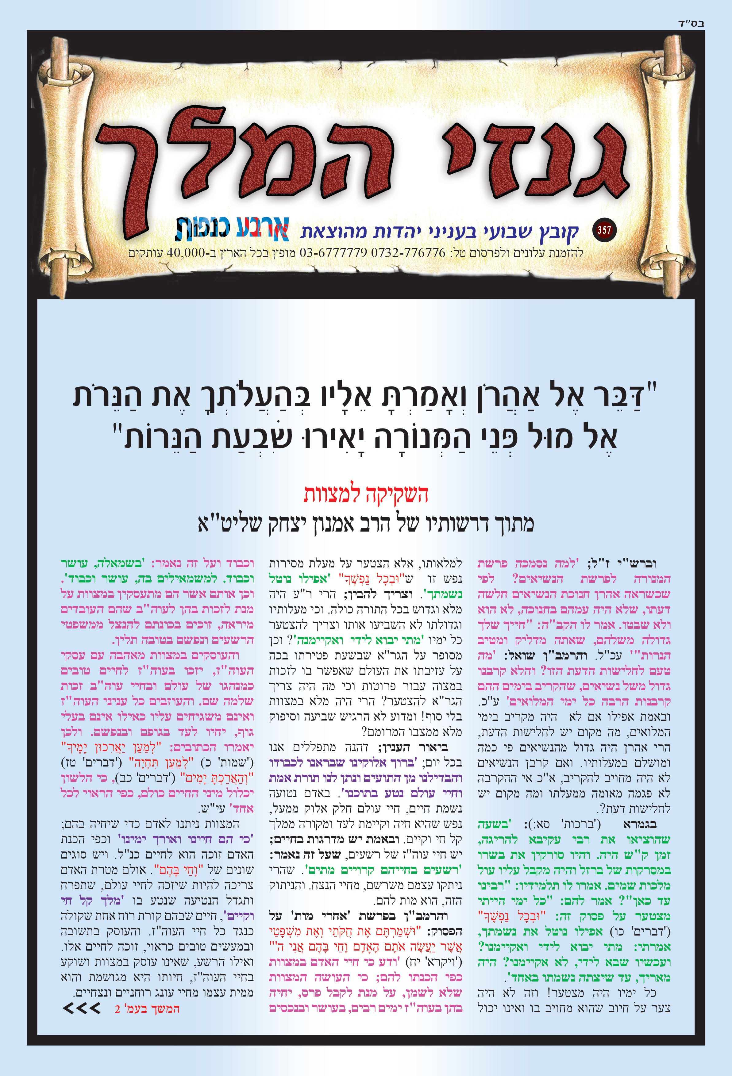 כבוד הרב, מאור עינינו, אין דף, עט ודיו היכולת להכיל את אשר ליבנו מבקש לומר. ב"ה בזכותכם רואים אנו עד כמה גדול אלוקי ישראל, כמה גדול אלוקי הרב אמנון יצחק, יה"ר שהשי"ת ישמרכם מכל מרעין בישין, וכל אויביכם שהם אויבי התורה הקדושה, שיפלו תחת רגליכם, אכי"ר. קשה ועצוב לראות את התופעה של קריעת מודעות, ואי אפשר להתרגל לכך. מר ממש. ואשרי הבחור שמדביק מחדש. כבוד הרב מלמד שאין אדם מלאך – אלא חצי אדם וחצי מלאך. אך כבוד הרב עצמו – אדם כמלאך. אתמול זכיתי למעט ביזיונות. שעת ניסיון קשה מאוד, אך ב"ה בזכותכם נשארתי שפויה לגמרי. יהי רצון שבזכות הבזיון שקבלתי ונתתי ברכת הדיוט למשפחה שהגיעה מרחוק לישועה – שיהיו להם בשורות טובות. בשורה משמחת נוספת, גיסי הניח ציצית ובירך, ואשתו ואנשים מסביב שמחו מאוד וענו אמן. ועוד כמה דברים יפים אירעו ביום שני. האוכל של א. מ. מטובל בטוב טעם ונדיבות, יה"ר שימשיכו ויצליחו, אמן. שוב אודה לכבוד הרב ולכל העמלים במלאכה – יהי רצון שהשם יתברך יגשים כל משאלות ליבכם לטובה. ותודה מיוחדת גם לרבנית היקרה, שאם לא אודה לה – הרי זו כפיות טובה ממש. ודבר אחרון היום בבוקר עברנו מהמקום, ששמו שלט ענק של מורינו והלב היה מלא שמחה לראות. יה"ר שנזכה ברחמים לקבל פני משיח צדקנו במהרה, אמן.