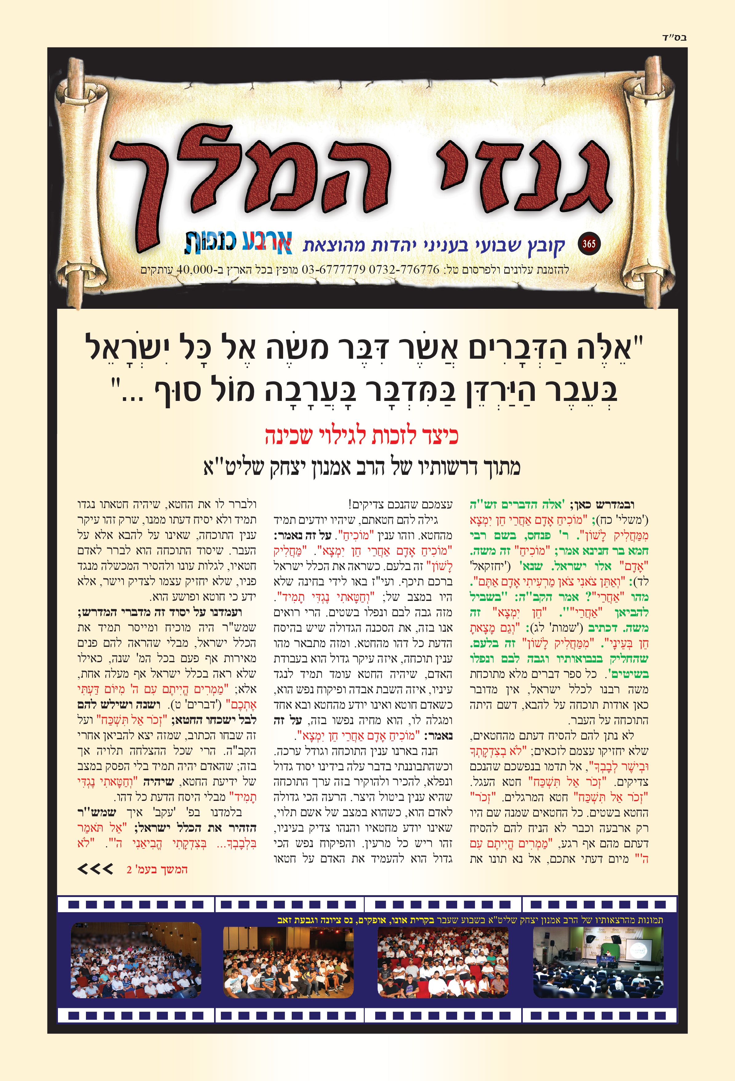 כבוד הרב, מאור עינינו, אין דף, עט ודיו היכולת להכיל את אשר ליבנו מבקש לומר. ב"ה בזכותכם רואים אנו עד כמה גדול אלוקי ישראל, כמה גדול אלוקי הרב אמנון יצחק, יה"ר שהשי"ת ישמרכם מכל מרעין בישין, וכל אויביכם שהם אויבי התורה הקדושה, שיפלו תחת רגליכם, אכי"ר. קשה ועצוב לראות את התופעה של קריעת מודעות, ואי אפשר להתרגל לכך. מר ממש. ואשרי הבחור שמדביק מחדש. כבוד הרב מלמד שאין אדם מלאך – אלא חצי אדם וחצי מלאך. אך כבוד הרב עצמו – אדם כמלאך. אתמול זכיתי למעט ביזיונות. שעת ניסיון קשה מאוד, אך ב"ה בזכותכם נשארתי שפויה לגמרי. יהי רצון שבזכות הבזיון שקבלתי ונתתי ברכת הדיוט למשפחה שהגיעה מרחוק לישועה – שיהיו להם בשורות טובות. בשורה משמחת נוספת, גיסי הניח ציצית ובירך, ואשתו ואנשים מסביב שמחו מאוד וענו אמן. ועוד כמה דברים יפים אירעו ביום שני. האוכל של א. מ. מטובל בטוב טעם ונדיבות, יה"ר שימשיכו ויצליחו, אמן. שוב אודה לכבוד הרב ולכל העמלים במלאכה – יהי רצון שהשם יתברך יגשים כל משאלות ליבכם לטובה. ותודה מיוחדת גם לרבנית היקרה, שאם לא אודה לה – הרי זו כפיות טובה ממש. ודבר אחרון היום בבוקר עברנו מהמקום, ששמו שלט ענק של מורינו והלב היה מלא שמחה לראות. יה"ר שנזכה ברחמים לקבל פני משיח צדקנו במהרה, אמן.