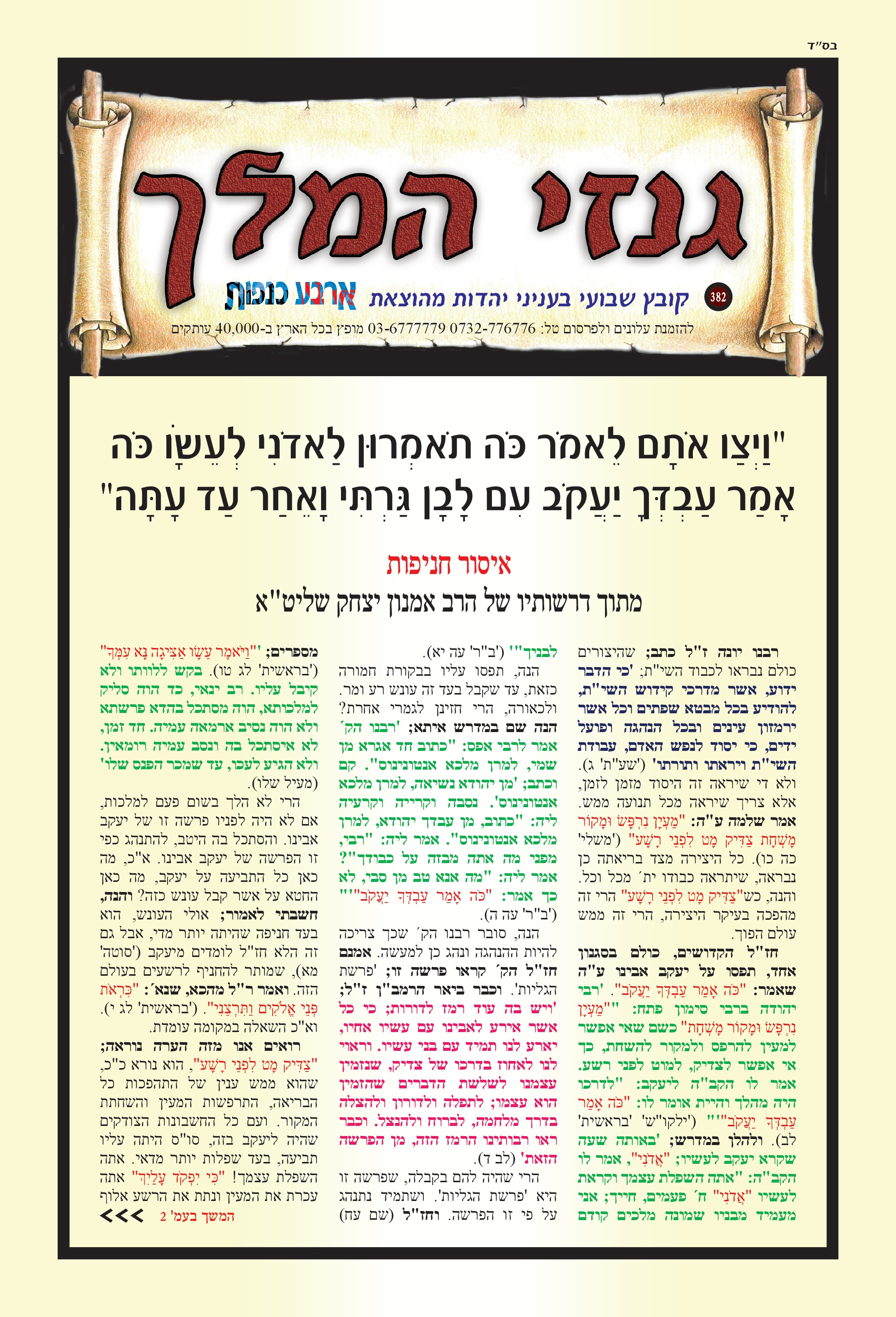 כבוד הרב, מאור עינינו, אין דף, עט ודיו היכולת להכיל את אשר ליבנו מבקש לומר. ב"ה בזכותכם רואים אנו עד כמה גדול אלוקי ישראל, כמה גדול אלוקי הרב אמנון יצחק, יה"ר שהשי"ת ישמרכם מכל מרעין בישין, וכל אויביכם שהם אויבי התורה הקדושה, שיפלו תחת רגליכם, אכי"ר. קשה ועצוב לראות את התופעה של קריעת מודעות, ואי אפשר להתרגל לכך. מר ממש. ואשרי הבחור שמדביק מחדש. כבוד הרב מלמד שאין אדם מלאך – אלא חצי אדם וחצי מלאך. אך כבוד הרב עצמו – אדם כמלאך. אתמול זכיתי למעט ביזיונות. שעת ניסיון קשה מאוד, אך ב"ה בזכותכם נשארתי שפויה לגמרי. יהי רצון שבזכות הבזיון שקבלתי ונתתי ברכת הדיוט למשפחה שהגיעה מרחוק לישועה – שיהיו להם בשורות טובות. בשורה משמחת נוספת, גיסי הניח ציצית ובירך, ואשתו ואנשים מסביב שמחו מאוד וענו אמן. ועוד כמה דברים יפים אירעו ביום שני. האוכל של א. מ. מטובל בטוב טעם ונדיבות, יה"ר שימשיכו ויצליחו, אמן. שוב אודה לכבוד הרב ולכל העמלים במלאכה – יהי רצון שהשם יתברך יגשים כל משאלות ליבכם לטובה. ותודה מיוחדת גם לרבנית היקרה, שאם לא אודה לה – הרי זו כפיות טובה ממש. ודבר אחרון היום בבוקר עברנו מהמקום, ששמו שלט ענק של מורינו והלב היה מלא שמחה לראות. יה"ר שנזכה ברחמים לקבל פני משיח צדקנו במהרה, אמן.