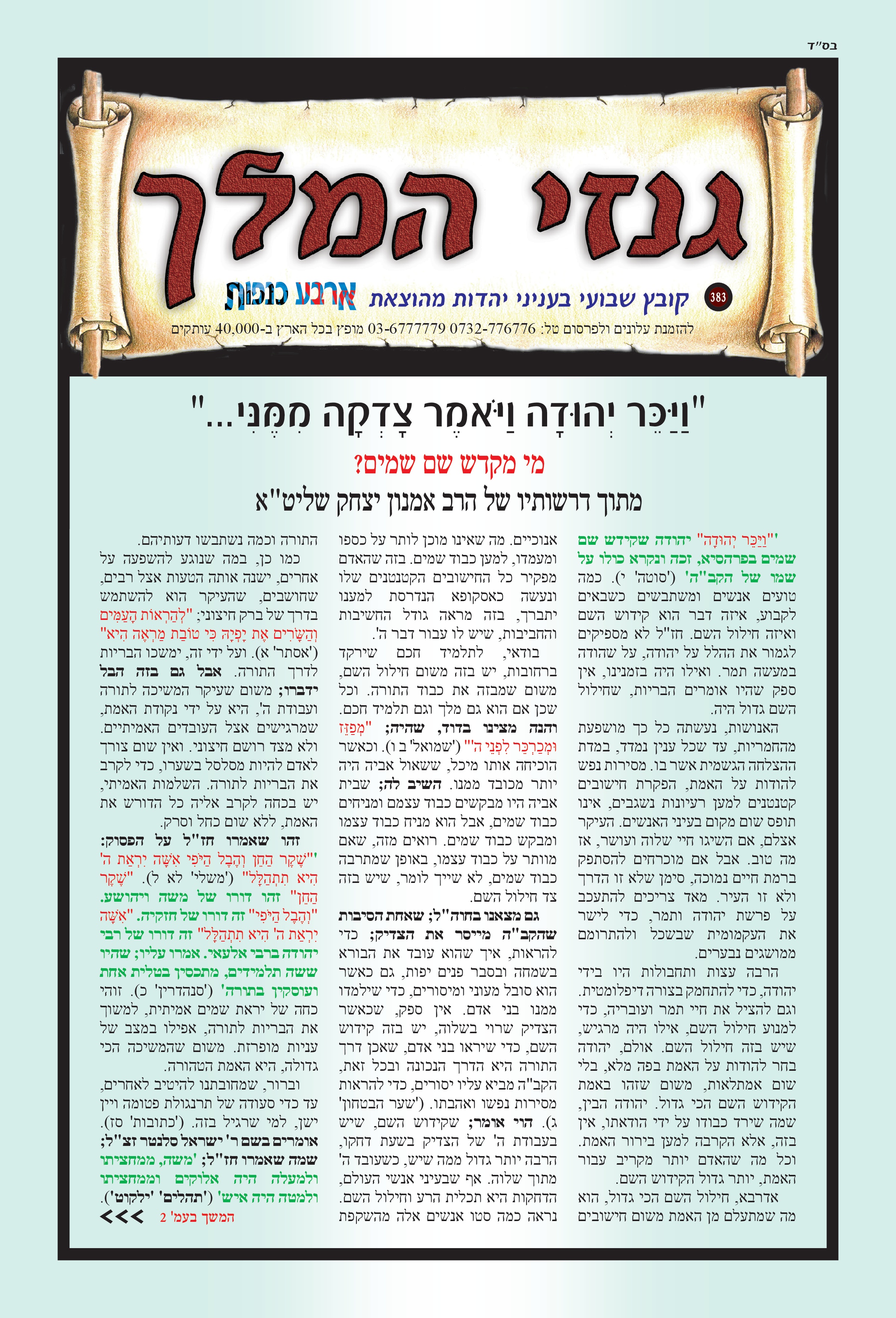 כבוד הרב, מאור עינינו, אין דף, עט ודיו היכולת להכיל את אשר ליבנו מבקש לומר. ב"ה בזכותכם רואים אנו עד כמה גדול אלוקי ישראל, כמה גדול אלוקי הרב אמנון יצחק, יה"ר שהשי"ת ישמרכם מכל מרעין בישין, וכל אויביכם שהם אויבי התורה הקדושה, שיפלו תחת רגליכם, אכי"ר. קשה ועצוב לראות את התופעה של קריעת מודעות, ואי אפשר להתרגל לכך. מר ממש. ואשרי הבחור שמדביק מחדש. כבוד הרב מלמד שאין אדם מלאך – אלא חצי אדם וחצי מלאך. אך כבוד הרב עצמו – אדם כמלאך. אתמול זכיתי למעט ביזיונות. שעת ניסיון קשה מאוד, אך ב"ה בזכותכם נשארתי שפויה לגמרי. יהי רצון שבזכות הבזיון שקבלתי ונתתי ברכת הדיוט למשפחה שהגיעה מרחוק לישועה – שיהיו להם בשורות טובות. בשורה משמחת נוספת, גיסי הניח ציצית ובירך, ואשתו ואנשים מסביב שמחו מאוד וענו אמן. ועוד כמה דברים יפים אירעו ביום שני. האוכל של א. מ. מטובל בטוב טעם ונדיבות, יה"ר שימשיכו ויצליחו, אמן. שוב אודה לכבוד הרב ולכל העמלים במלאכה – יהי רצון שהשם יתברך יגשים כל משאלות ליבכם לטובה. ותודה מיוחדת גם לרבנית היקרה, שאם לא אודה לה – הרי זו כפיות טובה ממש. ודבר אחרון היום בבוקר עברנו מהמקום, ששמו שלט ענק של מורינו והלב היה מלא שמחה לראות. יה"ר שנזכה ברחמים לקבל פני משיח צדקנו במהרה, אמן.