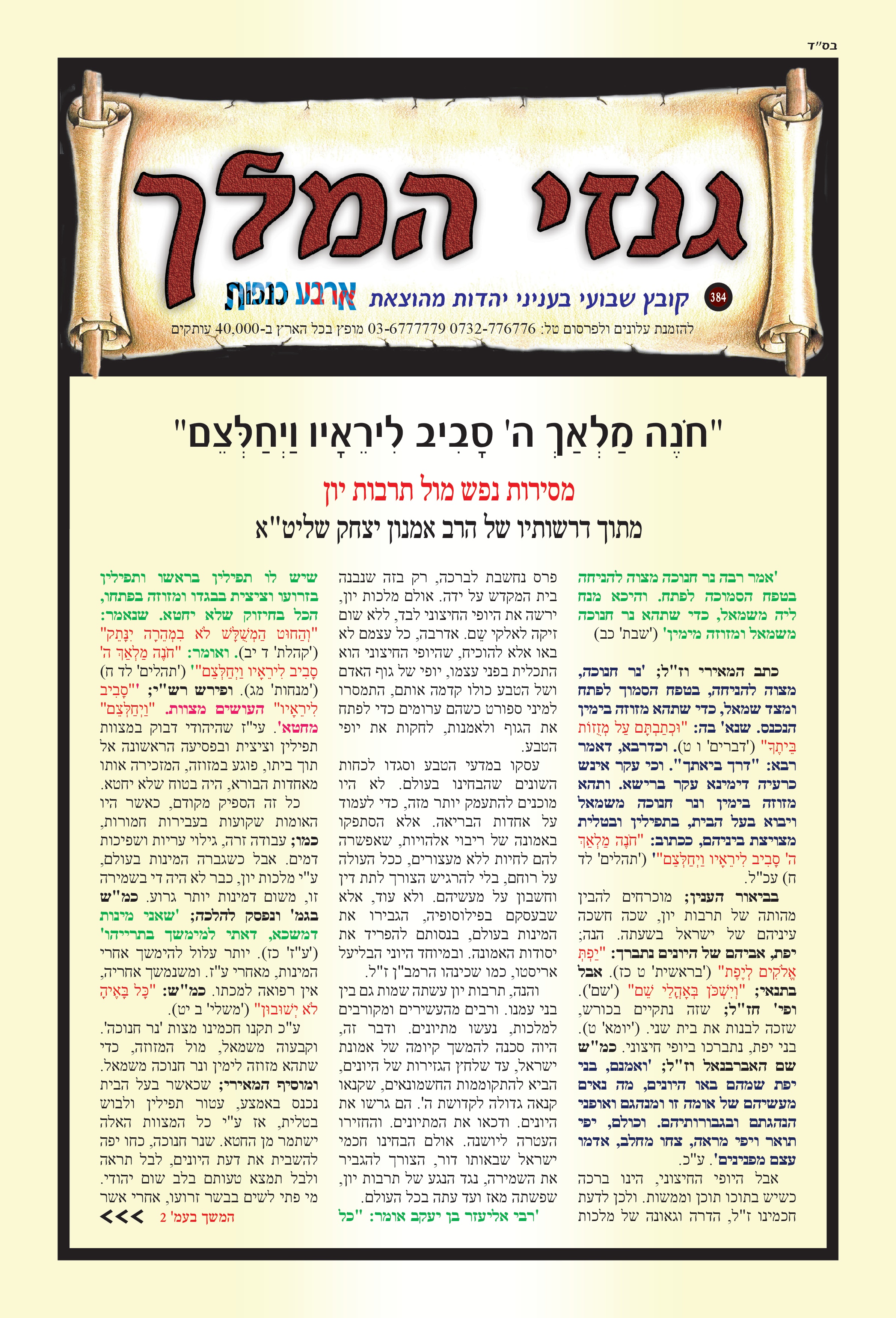 "חֹנֶה מַלְאַךְ יְהוָה סָבִיב לִירֵאָיו וַיְחַלְּצֵם" מסירות נפש מול תרבות יון