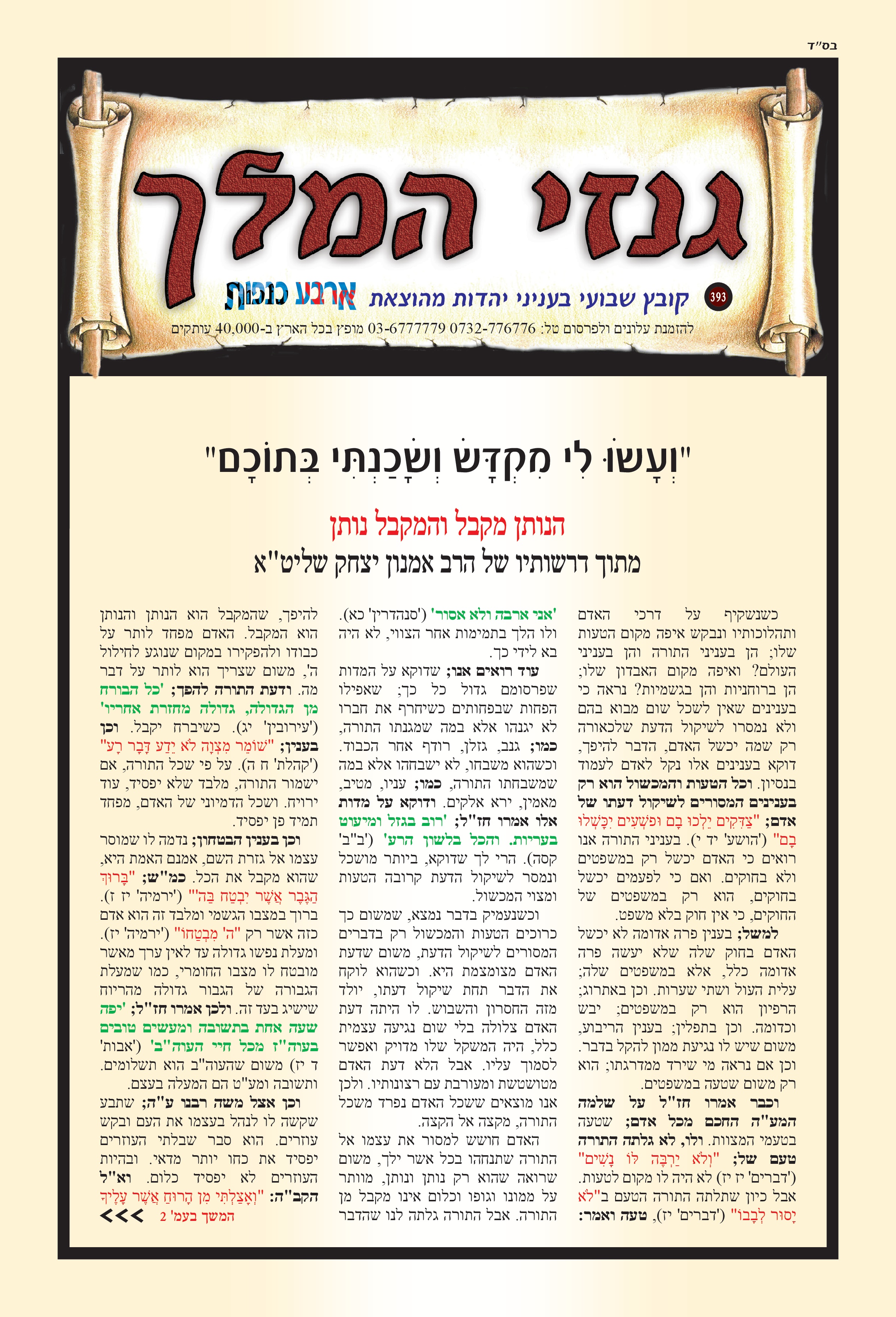 "וְעָשׂוּ לִי מִקְדָּשׁ וְשָׁכַנְתִּי בְּתוֹכָם" הנותן מקבל והמקבל נותן