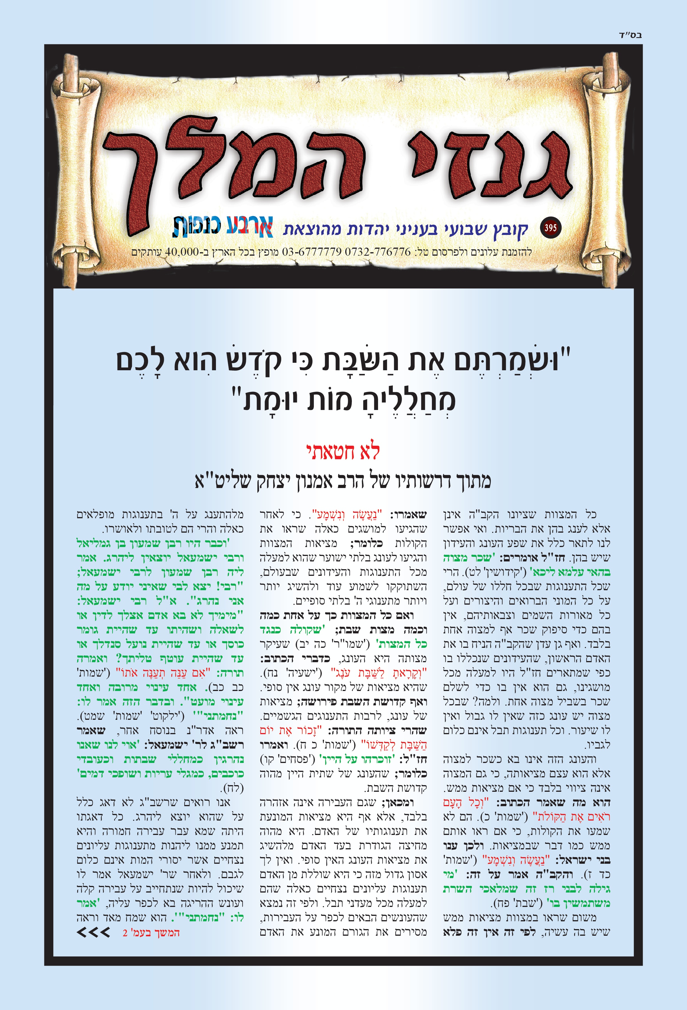כבוד הרב, מאור עינינו, אין דף, עט ודיו היכולת להכיל את אשר ליבנו מבקש לומר. ב"ה בזכותכם רואים אנו עד כמה גדול אלוקי ישראל, כמה גדול אלוקי הרב אמנון יצחק, יה"ר שהשי"ת ישמרכם מכל מרעין בישין, וכל אויביכם שהם אויבי התורה הקדושה, שיפלו תחת רגליכם, אכי"ר. קשה ועצוב לראות את התופעה של קריעת מודעות, ואי אפשר להתרגל לכך. מר ממש. ואשרי הבחור שמדביק מחדש. כבוד הרב מלמד שאין אדם מלאך – אלא חצי אדם וחצי מלאך. אך כבוד הרב עצמו – אדם כמלאך. אתמול זכיתי למעט ביזיונות. שעת ניסיון קשה מאוד, אך ב"ה בזכותכם נשארתי שפויה לגמרי. יהי רצון שבזכות הבזיון שקבלתי ונתתי ברכת הדיוט למשפחה שהגיעה מרחוק לישועה – שיהיו להם בשורות טובות. בשורה משמחת נוספת, גיסי הניח ציצית ובירך, ואשתו ואנשים מסביב שמחו מאוד וענו אמן. ועוד כמה דברים יפים אירעו ביום שני. האוכל של א. מ. מטובל בטוב טעם ונדיבות, יה"ר שימשיכו ויצליחו, אמן. שוב אודה לכבוד הרב ולכל העמלים במלאכה – יהי רצון שהשם יתברך יגשים כל משאלות ליבכם לטובה. ותודה מיוחדת גם לרבנית היקרה, שאם לא אודה לה – הרי זו כפיות טובה ממש. ודבר אחרון היום בבוקר עברנו מהמקום, ששמו שלט ענק של מורינו והלב היה מלא שמחה לראות. יה"ר שנזכה ברחמים לקבל פני משיח צדקנו במהרה, אמן.
