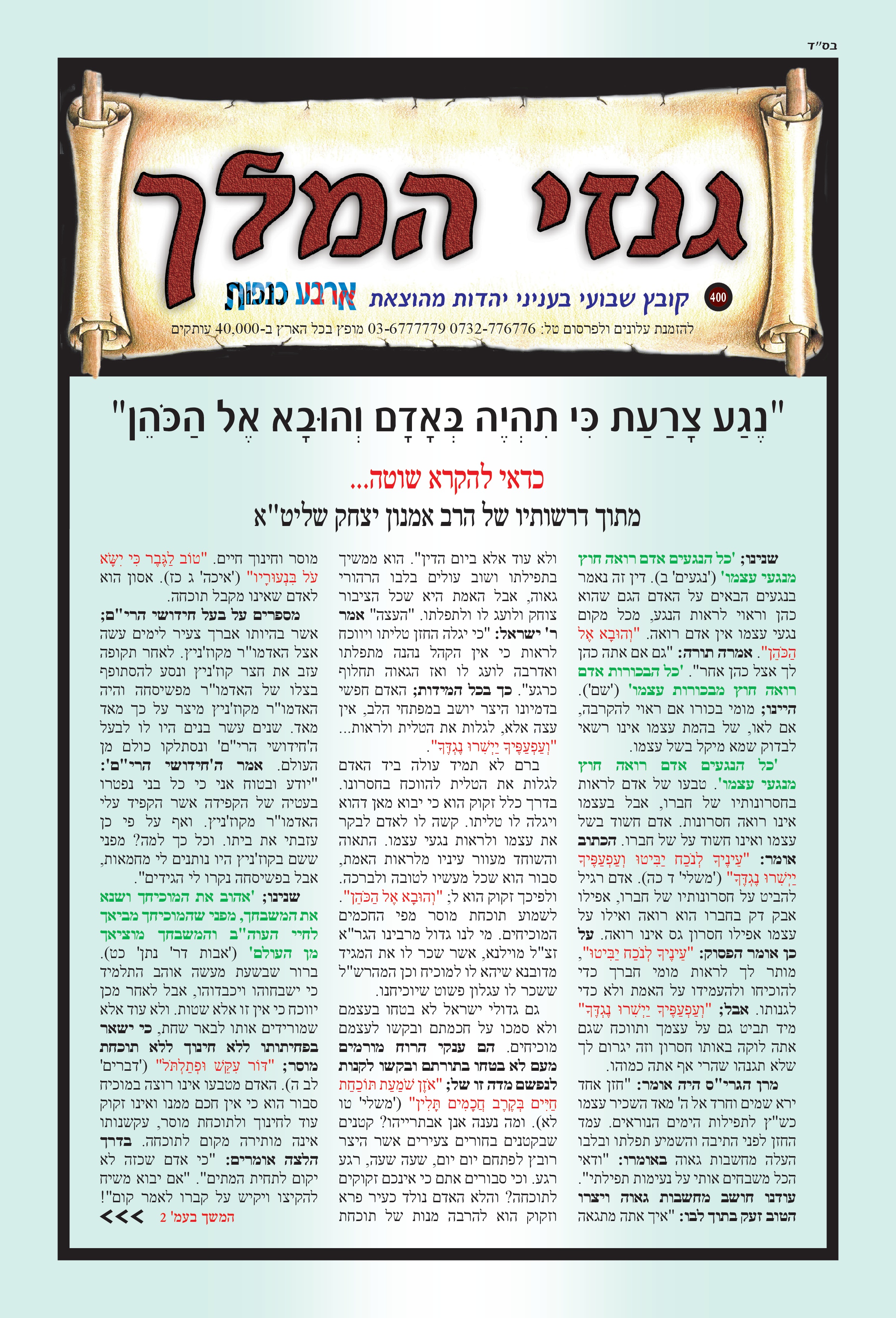 כבוד הרב, מאור עינינו, אין דף, עט ודיו היכולת להכיל את אשר ליבנו מבקש לומר. ב"ה בזכותכם רואים אנו עד כמה גדול אלוקי ישראל, כמה גדול אלוקי הרב אמנון יצחק, יה"ר שהשי"ת ישמרכם מכל מרעין בישין, וכל אויביכם שהם אויבי התורה הקדושה, שיפלו תחת רגליכם, אכי"ר. קשה ועצוב לראות את התופעה של קריעת מודעות, ואי אפשר להתרגל לכך. מר ממש. ואשרי הבחור שמדביק מחדש. כבוד הרב מלמד שאין אדם מלאך – אלא חצי אדם וחצי מלאך. אך כבוד הרב עצמו – אדם כמלאך. אתמול זכיתי למעט ביזיונות. שעת ניסיון קשה מאוד, אך ב"ה בזכותכם נשארתי שפויה לגמרי. יהי רצון שבזכות הבזיון שקבלתי ונתתי ברכת הדיוט למשפחה שהגיעה מרחוק לישועה – שיהיו להם בשורות טובות. בשורה משמחת נוספת, גיסי הניח ציצית ובירך, ואשתו ואנשים מסביב שמחו מאוד וענו אמן. ועוד כמה דברים יפים אירעו ביום שני. האוכל של א. מ. מטובל בטוב טעם ונדיבות, יה"ר שימשיכו ויצליחו, אמן. שוב אודה לכבוד הרב ולכל העמלים במלאכה – יהי רצון שהשם יתברך יגשים כל משאלות ליבכם לטובה. ותודה מיוחדת גם לרבנית היקרה, שאם לא אודה לה – הרי זו כפיות טובה ממש. ודבר אחרון היום בבוקר עברנו מהמקום, ששמו שלט ענק של מורינו והלב היה מלא שמחה לראות. יה"ר שנזכה ברחמים לקבל פני משיח צדקנו במהרה, אמן.