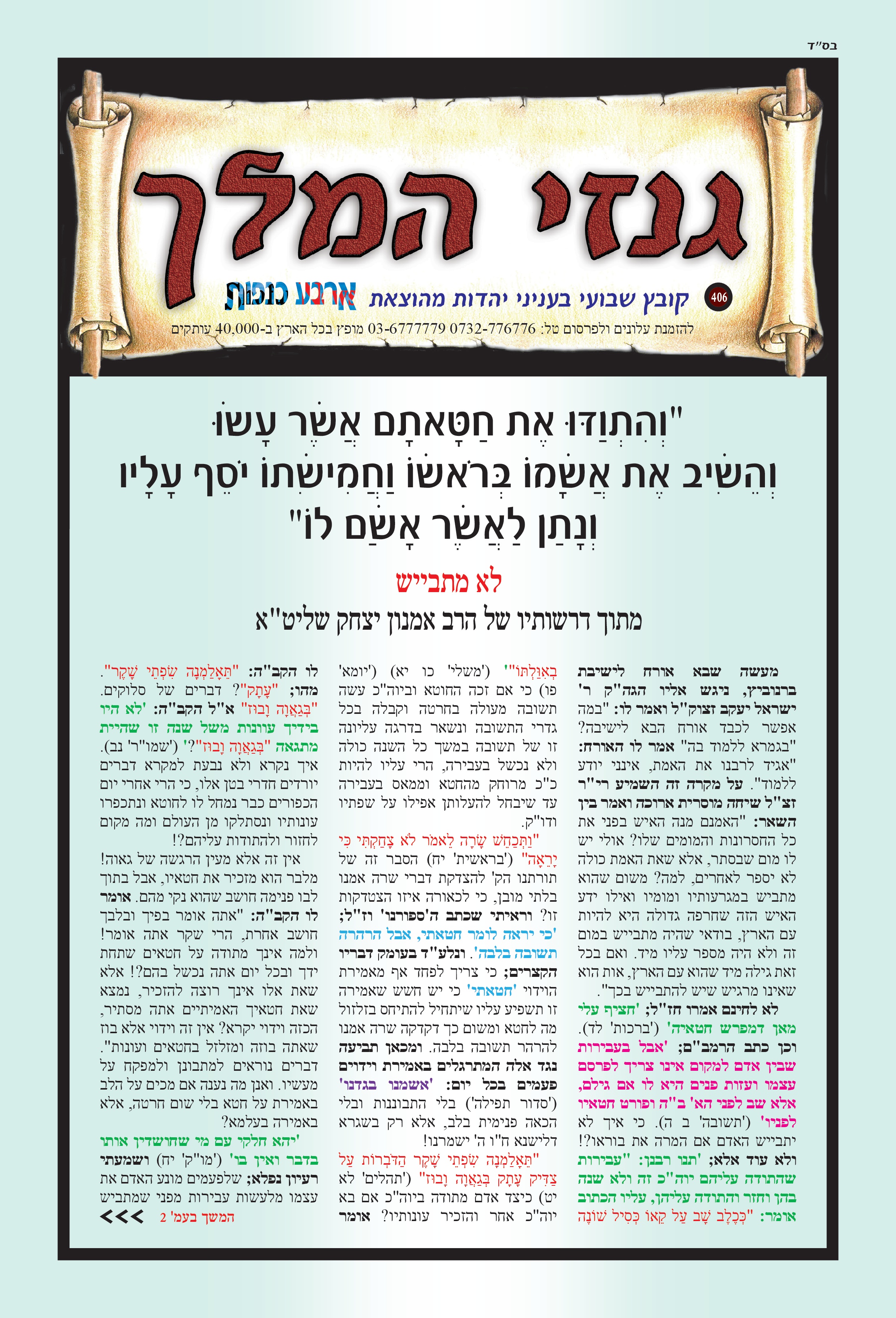 כבוד הרב, מאור עינינו, אין דף, עט ודיו היכולת להכיל את אשר ליבנו מבקש לומר. ב"ה בזכותכם רואים אנו עד כמה גדול אלוקי ישראל, כמה גדול אלוקי הרב אמנון יצחק, יה"ר שהשי"ת ישמרכם מכל מרעין בישין, וכל אויביכם שהם אויבי התורה הקדושה, שיפלו תחת רגליכם, אכי"ר. קשה ועצוב לראות את התופעה של קריעת מודעות, ואי אפשר להתרגל לכך. מר ממש. ואשרי הבחור שמדביק מחדש. כבוד הרב מלמד שאין אדם מלאך – אלא חצי אדם וחצי מלאך. אך כבוד הרב עצמו – אדם כמלאך. אתמול זכיתי למעט ביזיונות. שעת ניסיון קשה מאוד, אך ב"ה בזכותכם נשארתי שפויה לגמרי. יהי רצון שבזכות הבזיון שקבלתי ונתתי ברכת הדיוט למשפחה שהגיעה מרחוק לישועה – שיהיו להם בשורות טובות. בשורה משמחת נוספת, גיסי הניח ציצית ובירך, ואשתו ואנשים מסביב שמחו מאוד וענו אמן. ועוד כמה דברים יפים אירעו ביום שני. האוכל של א. מ. מטובל בטוב טעם ונדיבות, יה"ר שימשיכו ויצליחו, אמן. שוב אודה לכבוד הרב ולכל העמלים במלאכה – יהי רצון שהשם יתברך יגשים כל משאלות ליבכם לטובה. ותודה מיוחדת גם לרבנית היקרה, שאם לא אודה לה – הרי זו כפיות טובה ממש. ודבר אחרון היום בבוקר עברנו מהמקום, ששמו שלט ענק של מורינו והלב היה מלא שמחה לראות. יה"ר שנזכה ברחמים לקבל פני משיח צדקנו במהרה, אמן.
