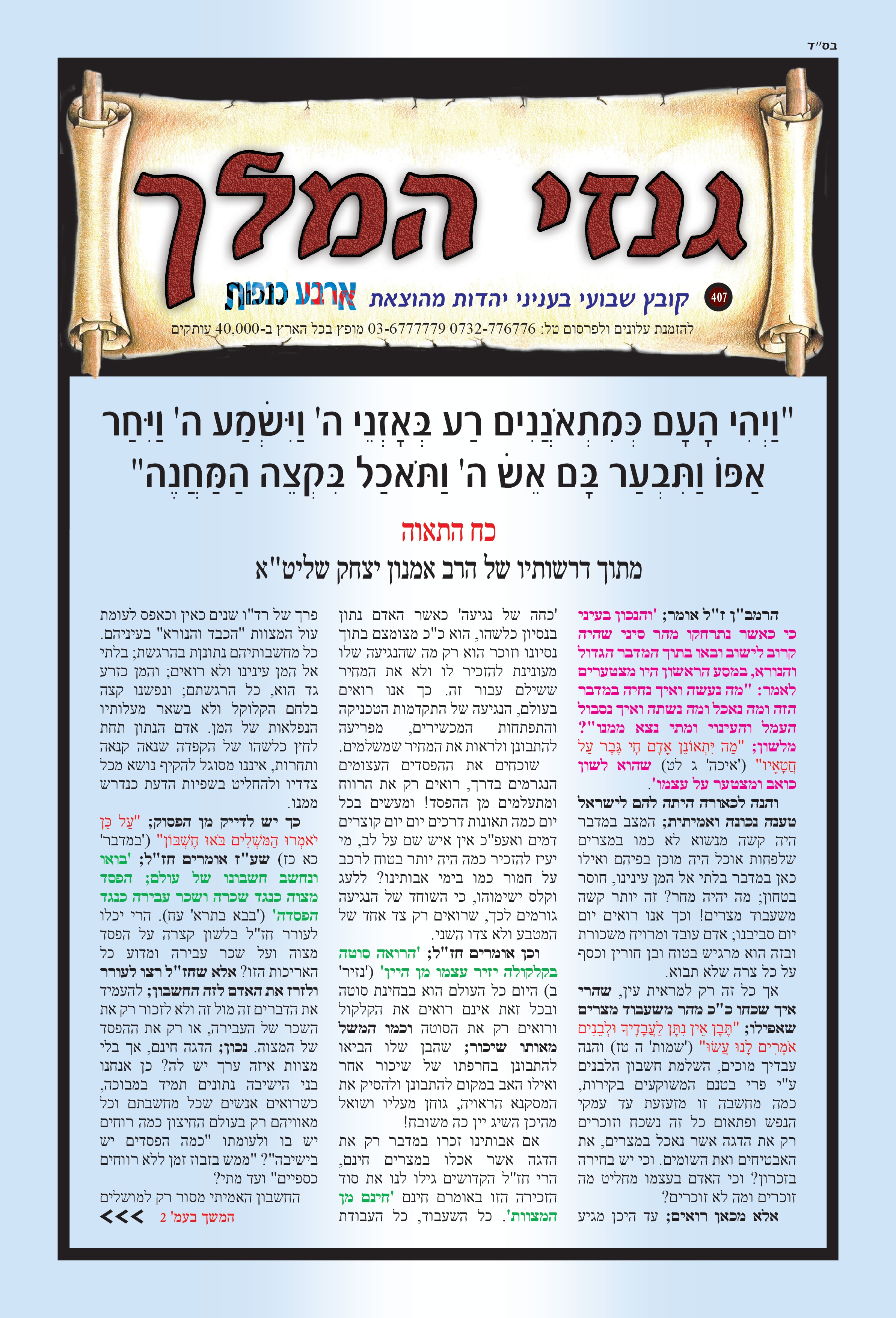 "וַיְהִי הָעָם כְּמִתְאֹנְנִים רַע בְּאָזְנֵי יְהוָה וַיִּשְׁמַע יְהוָה וַיִּחַר אַפּוֹ וַתִּבְעַר בָּם אֵשׁ יְהוָה וַתֹּאכַל בִּקְצֵה הַמַּחֲנֶה" כח התאוה