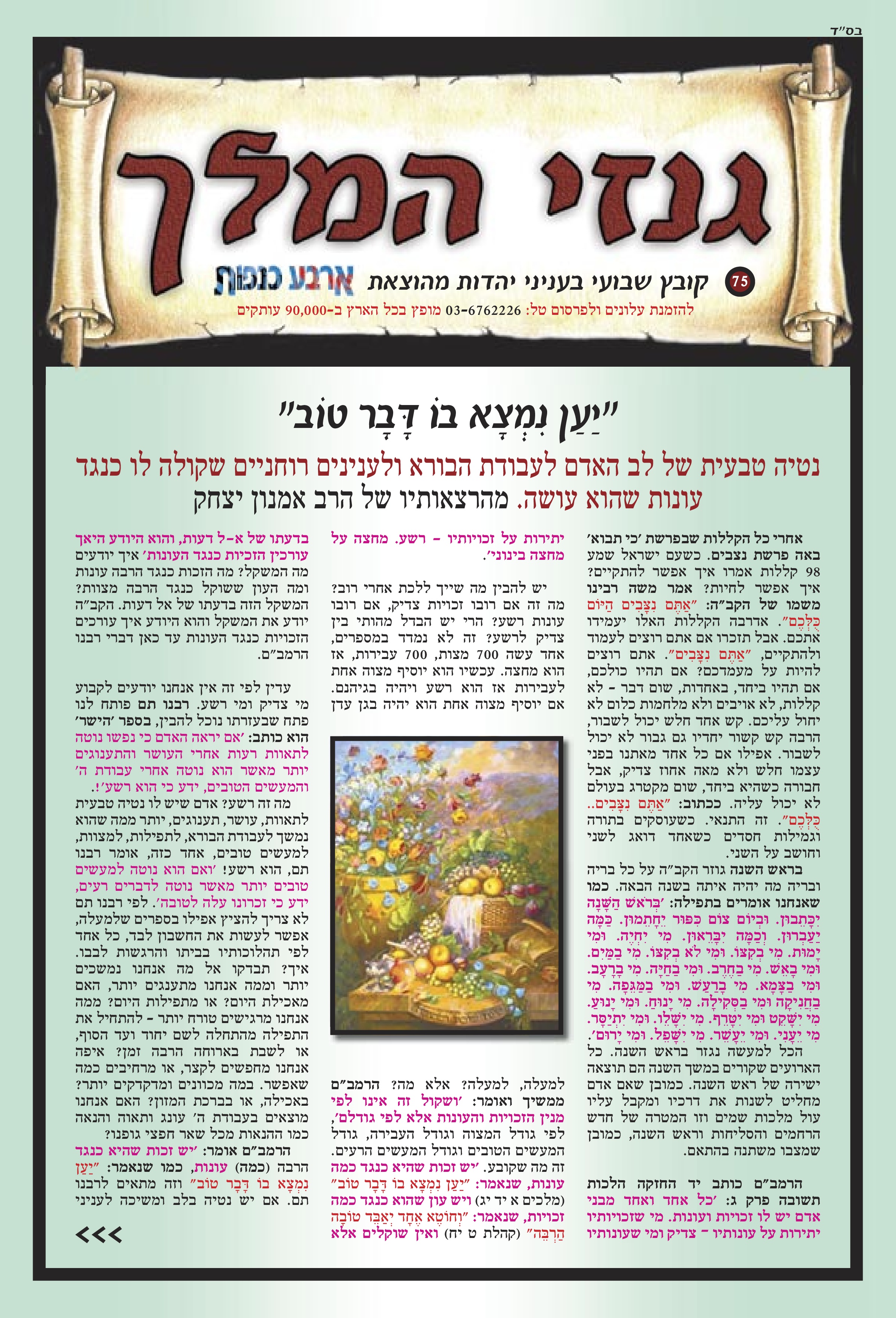 כפרות "כִּי עֲוֹנֹתַי עָבְרוּ רֹאשִׁי" בעל 'הנועם אלימלך' שלח את אחד מחסידיו לצפות כיצד עושה כפרי אחד את הכפרות. ומה ראה?