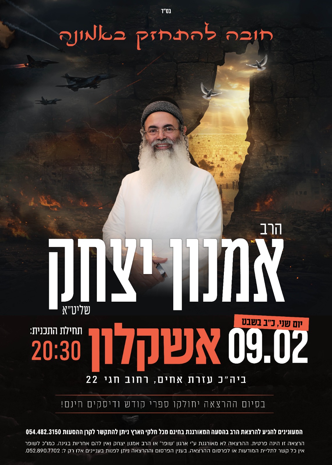 ב"ה זכינו בכבוד הרב, תלמיד חכם מופלג, סיני ועוקר הרים "וְצַדִּיק יְסוֹד עוֹלָם" (משלי י, כה) יראת השמים, הטהרה והעמידה על האמת ניכרות בכל דבריו. זכותו תגן על כל עם ישראל, אמן (הרב אמנון יצחק בראיון אחד על אחד אצל אלעזר שטורם ערוץ TOV). יהי רצון שהשי"ת יברך את כל העוסקים עמו בהפצת תורה ואמונה, בכל ברכות התורה. שבת שלום וחג שמח.